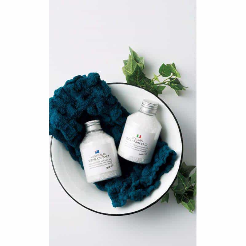 - バスソルト(イタリアン)(約180g)・バスソルト(オーストラリア)(約175g)・ブラシ×各1、マイクロファイバークロス(約250×250㎜)・ふわもこウォッシュタオル(約220×220㎜)×各2