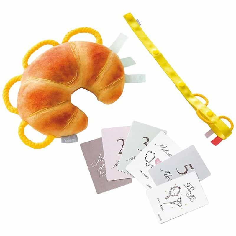 大人気のわっかラトルと、おもちゃの落下・紛失を防ぐトイストラップ、くすみカラーが可愛い月齢・選び取りカードの3点セットです。