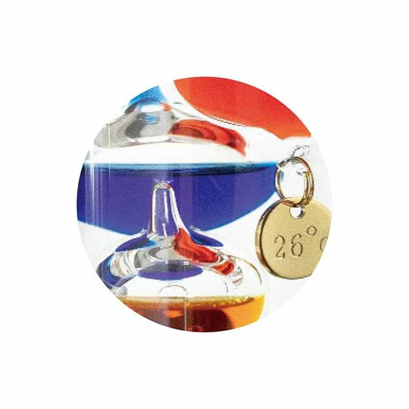 物理学者のガリレオ・ガリレイが発見した「液体の比重が気温によって変化する」原理を用いて作られた温度計。ガリレオ温度計とも呼ばれます。実際の気温は上層部に浮いているガラス球体の最下段のガラス球体に付いているプレートで読み取ります。