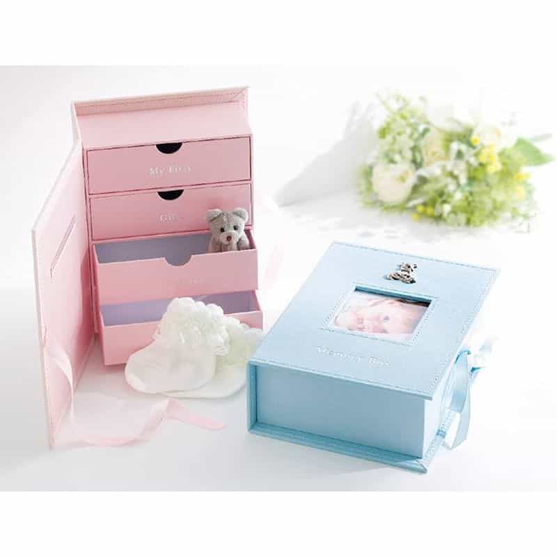 お子さまの大切な思い出を保管できるメモリアルボックスです。柔らかな色合いやオーナメント、特別感を演出するリボンなど細部までこだわったデザインで、成長したお子様に贈るのもおすすめ。表紙には写真を、4つの引き出しにはへその緒ケースや出産時のタグ、ファーストシューズ、おもちゃなどを自由に保管できます。ボックスの中には4つの引き出しが内蔵しており、へその緒のケース、マタニティマーク、初めて使ったカトラリー、お気に入りの小さなおもちゃ、靴下やベビーリングなど、お子さまのご誕生に関わるたくさんの思い出の品を引き出しに収納できます。正面窓にはお気に入りの写真を入れると、世界でたった一つのオリジナルのメモリアルボックスが完成します。お子さまが成人した時などの記念にプレゼントするのにもおすすめです。