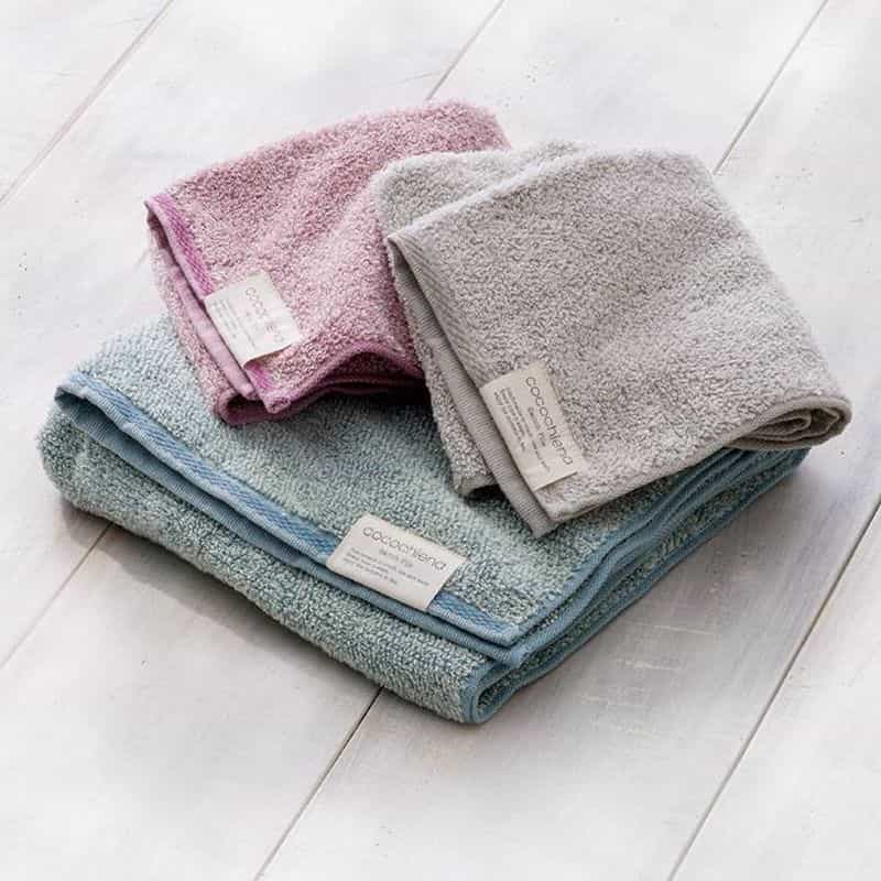 スイッチパイルという特許技術を使っており、洗ってもパイルがへたりにくく、膨らみのある風合いを持続させます。お肌に触れるパイルは綿100%。中に隠れている部分にマイクロファイバー混紡の高吸水糸を使用しており、吸水発散を更に促します。甘撚り糸の柔らかい風合いも特徴です。