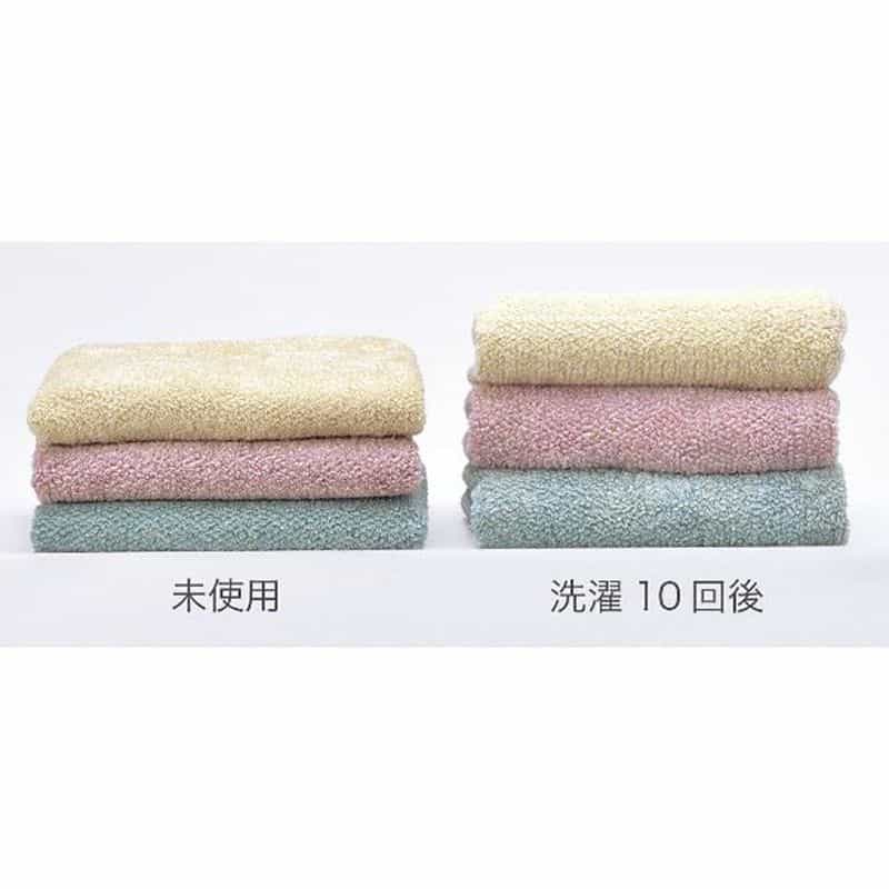 スイッチパイルという特許技術を使っており、洗ってもパイルがへたりにくく、膨らみのある風合いを持続させます。お肌に触れるパイルは綿100%。中に隠れている部分にマイクロファイバー混紡の高吸水糸を使用しており、吸水発散を更に促します。甘撚り糸の柔らかい風合いも特徴です。
