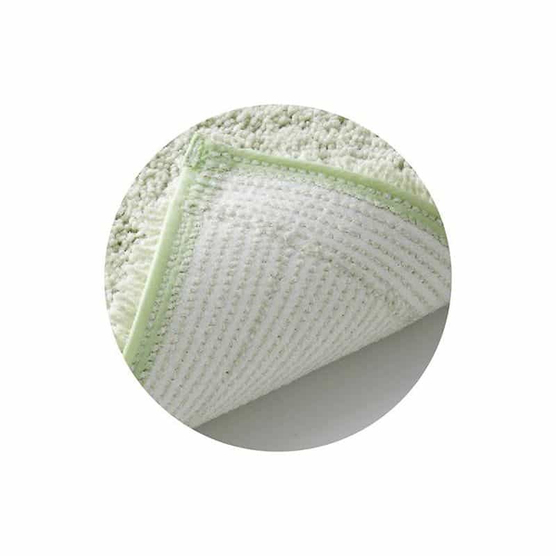 一見すると普通のバスマットだけど実はすごいバスマット。熟練した技術で1枚ずつ丁寧に手作りしています。「すごい」の秘密はみためでほとんどわからない2種類の糸。吸水速乾のポリエステル糸と抗菌防臭のアクリル糸2本の糸をツイストして1本に組み合わせることでへたりに強い弾力性のあるコシが生み出され、さらっとした足触りを実現しました。さらにうれしい防カビの機能をプラス。お洗濯後も乾きが早く、気軽に洗えます。