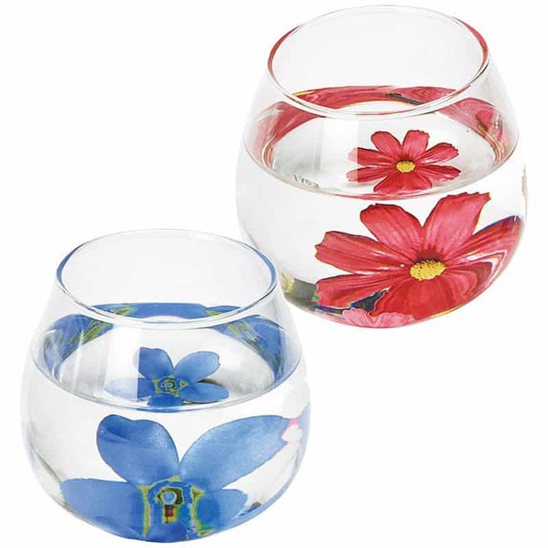 色鮮やかな花をうかべた花手水をモチーフしたゆらりグラス。光の屈折により水面に花が浮かんでいるようにみえたり模様のように大きく見えたり見る角度によってその表情が変ります。
