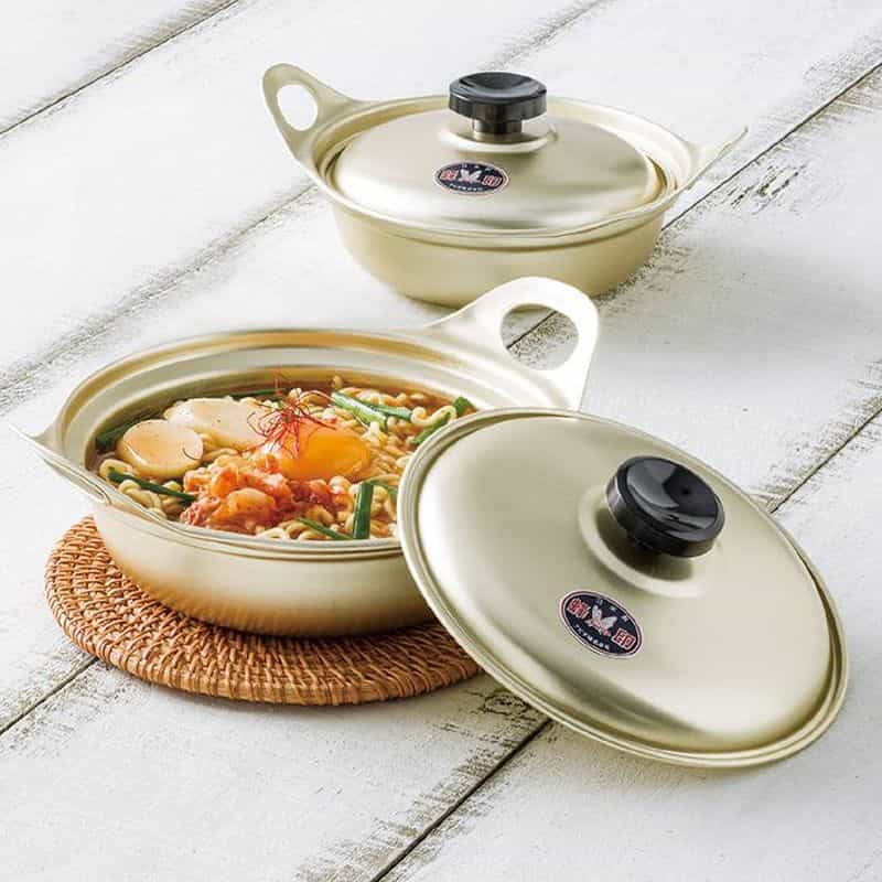 一人用のアルミ寄せ鍋。直火にかけて、そのまま器として使用できます。アルミ特有の熱伝導の良さを生かし、昔ながらのレトロなデザインが特徴。