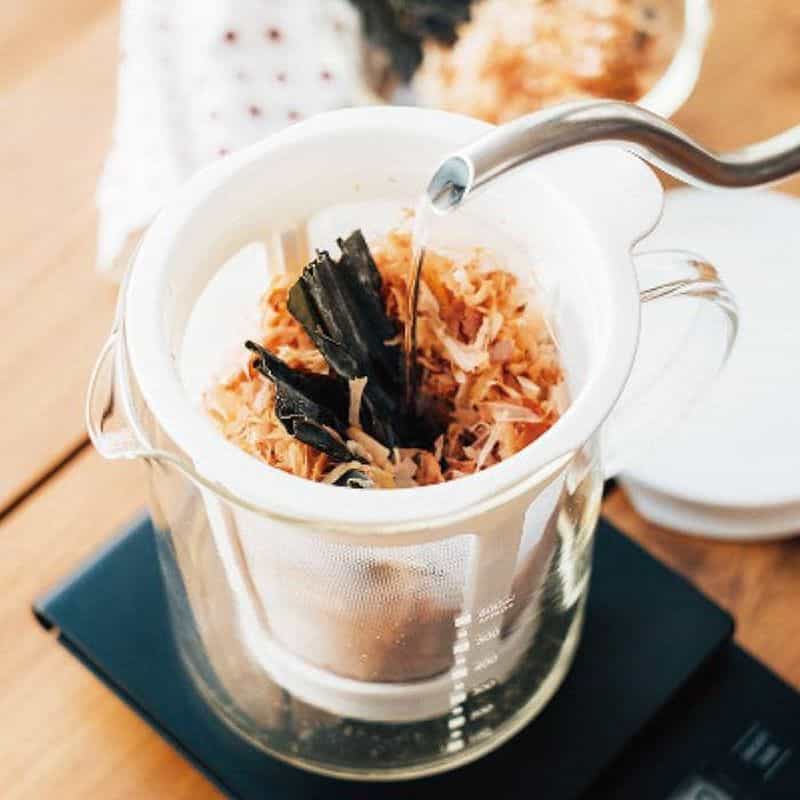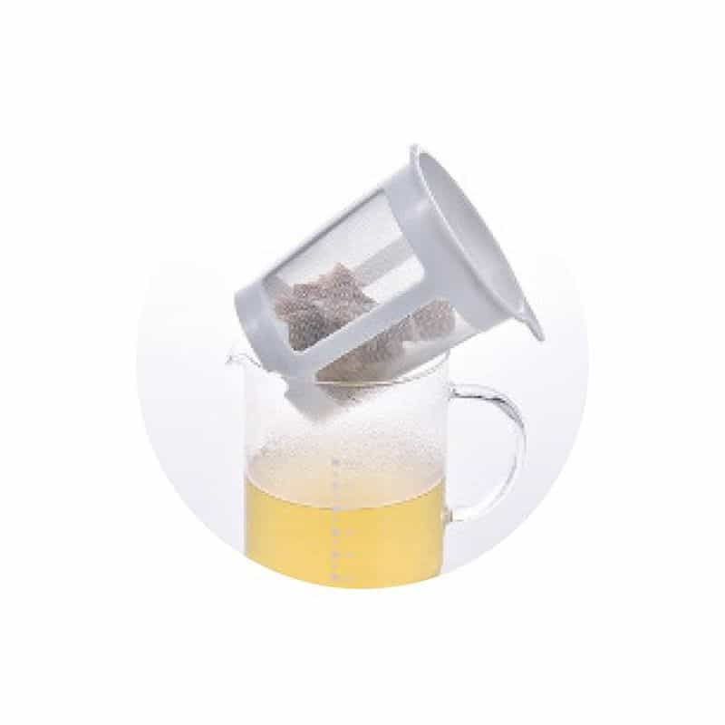 ポットの底まで届く大きなストレーナーで、だしをしっかり抽出。ストレーナーのへこみ部をポットの縁に引っ掛けて、最後の一滴まで抽出します。口が広いので洗いやすくて衛生的にお使いいただけます。オリジナルレシピ付き。