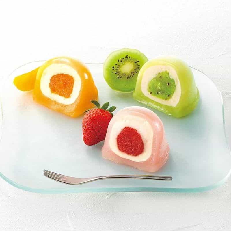 厳選したフルーツとコクのあるクリームを、もちもちのお餅で包み込んだ、甘酸っぱく、クリーミーな味わい。いちご・・・いちご果肉入りソース、クリーム、もちもちのお餅が合わさる華やかな味わい。みかん・・・みかん果肉入りソース、クリーム、もちもちのお餅が合わさる爽やかな味わい。キウイ・・・キウイ果肉入りソース、クリーム、もちもちのお餅が合わさるフルーティーな味わい。