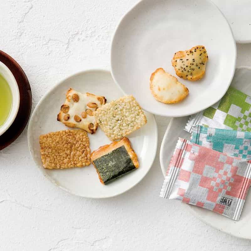 ひとくちサイズのおかき6種をすべて個包装にして詰合せました。醤油・青海苔、胡麻・海老・大豆・海苔巻とバラエティに富んだいます。カラフルな化粧箱のデザインは、日本の伝統工芸「寄木細工」をイメージしています。