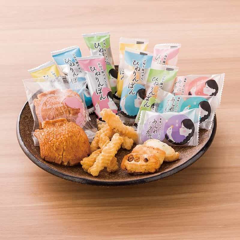 ふっくらソフトなおかきと、カリット揚がったひねり揚げのアソートです、味はおかきが「甘塩」「塩」「あまから醤油」の種類に、ひねり揚げの「塩」「カレー」の2種類、合わせて5種類のお味がお楽しみ頂けます。