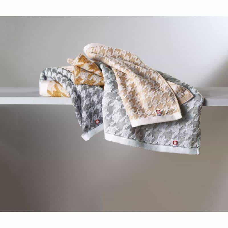 滑らかなテクスチャ―と、心躍るモダンデザイン。 英国生まれの世界中で好まれるお洒落な千鳥格子をモチーフに、代表色のチャコールグレー・キャメルで今治タオルに仕立ててみました。