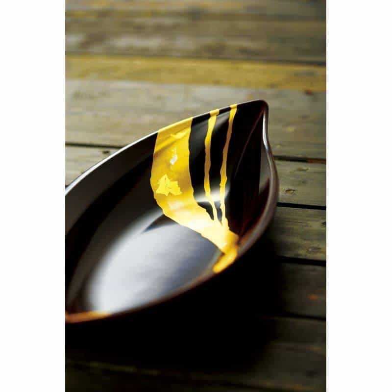 伝統の塗 金沢の純金箔を使った高級蒔絵漆器です。溜塗りの深みの有る塗り色と上品さが感じられる一品です。溜塗りとは下に赤色を一度塗って、その上から濃い色の焦げ茶色を重ねる技法で、深みの有る色調になります。煌びやかな金箔の金の色合いととても調和しています。